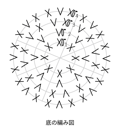 ①わの作り目をしてこま編みで底を編みます(底の編み図参照)。