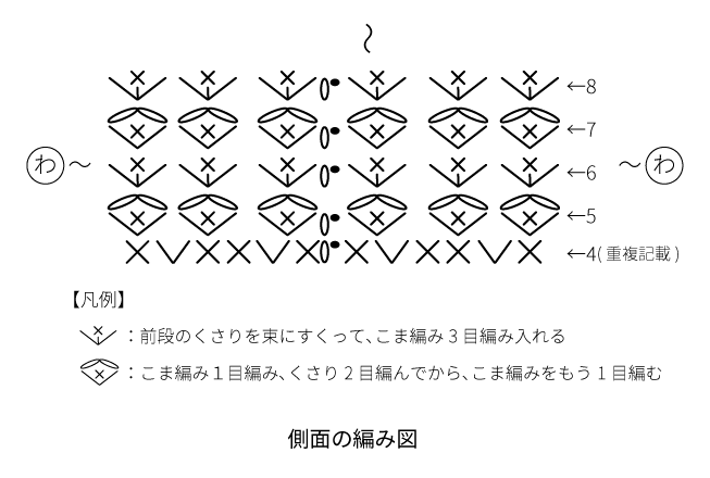 ②底から続けて側面の模様を編み(側面の編み図参照)、中に入れたいものの高さに合うところまで続けて編みます。