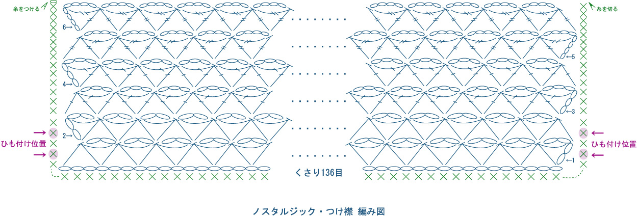 別ページに「麻の葉模様の編み方」「麻の葉模様の編み方Ⅱ」もありますので、編み地の編み方のご参考になさってみてください。