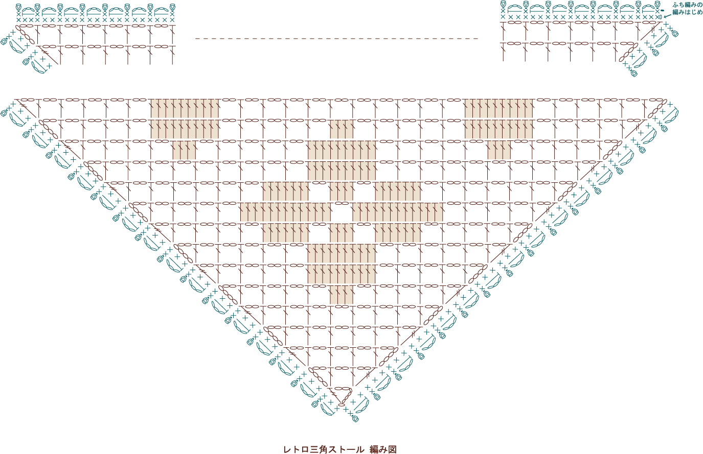 このストールは、何段目で編むのをやめてもふち編みの目数が合うようにしています。なので、模様編みの段数を変えて、お花模様をもう1セット縦に追加する、ということも可能です。