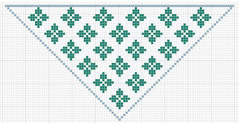 三角ストールは下のとがったところから編みはじめるのが好みです。それで、ちょうどいい大きさになるまで編んで完成!というのが、融通がきいて編みやすいのですよね。