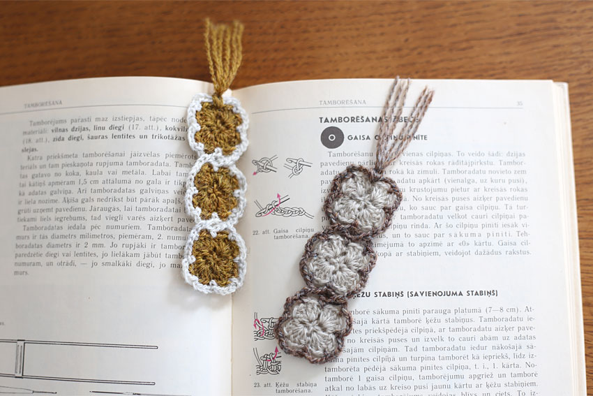 作品のとおり栞として使う場合、糸が太いと厚みが出すぎてしまうので、やはり中細くらいがよさそうですが、さらに細いレース糸などで編んでみるのも素敵ですね。