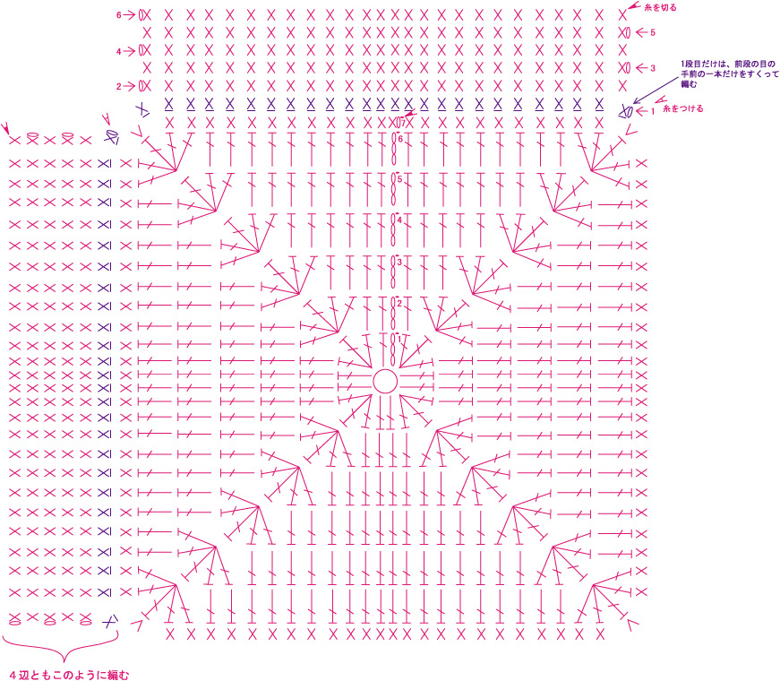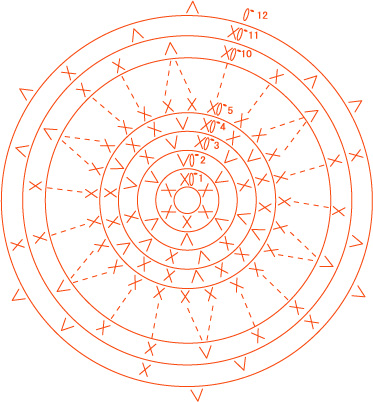三方の上(外側)編み図のように、6段目までは長編みとくさり編みで、毎段16目ずつ増やしながら編みます。