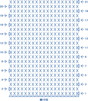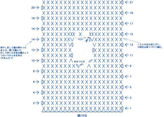 穴のある編み地は2枚ともこのように編み、この筒どうしを巻きかがりでとめます(右のイラスト参照)。