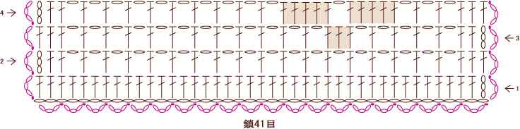 ②2段目は、「長編み1 + くさり1」を繰り返す、くさり1目の方眼編みをします。