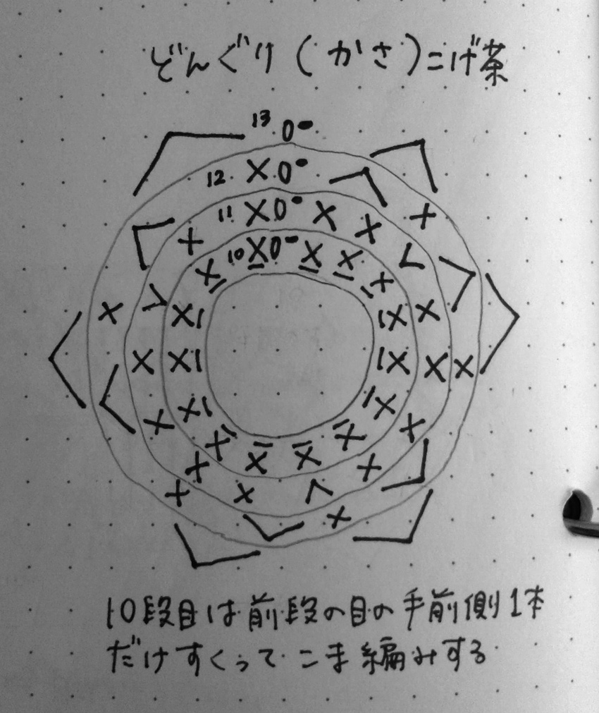 11段目は増し目しながら編み、12~13段目は減目しながら編みます。