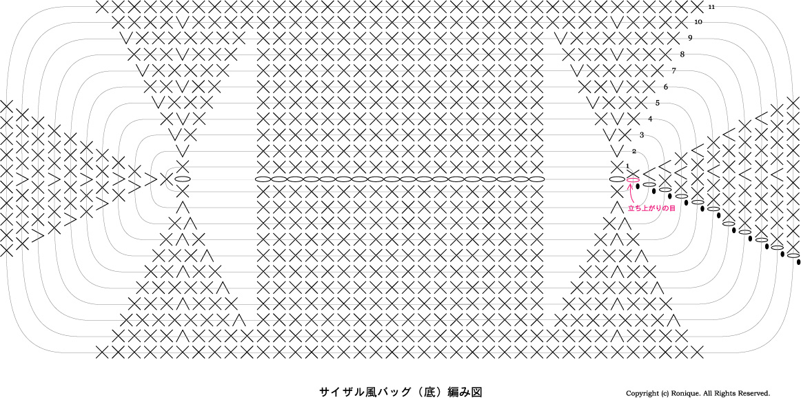 10段目まで、毎段、両端で増し目をしながら編み進めます。