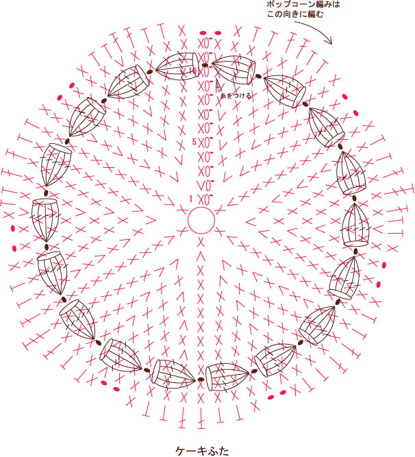 ふたの土台ができたら、糸をつけて、ホイップクリームをイメージしたポップコーン編みを編みつけていきます。