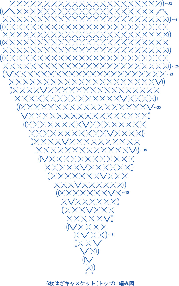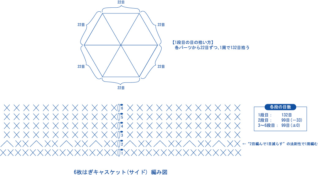 拾う目数は、6枚の各パーツから22目ずつ、1周で132目になるようにします(サイド 編み図 参照)。