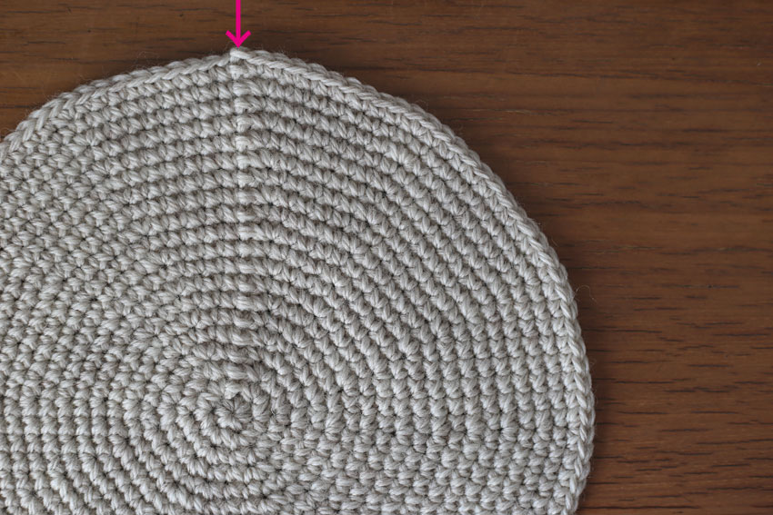立ち上がりのくさりを編まず、段の最後で引き抜き編みもしないで編むメリットとしては、段の変わり目(立ち上がり位置)がないため、きれいな編み地に仕上がるという点があげられます。